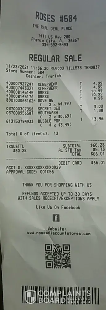 On Saturday March 12, 2022 I purchase battery in store which was price at $3.99 in store but when I check out it ring up $5.99 , I notice the error before leave out of the store, I turn around and explain this to cashier the batteries is ringing up wrong she call so name Vanessa to come help me she up to the front of the store with so Krispy Kreme doughnuts in her hand, very unprofessional. I was very disappoint the no one can give a correct answer on when my money with be credit back to my account. later on the day I check my account to see if my money in pending back to my account it was no show, so I contact Rose discount Store#528 located at 4001 Eastern Blvd Montgomery Alabama, Spoke with person who said he was the manger of that store refused to give his name very impolite rude person to be a manager he overtalking me and come not give correct information regarding to how long take for a refund credit to go back on debit card. I will not recommend anyone to shop at this store cause