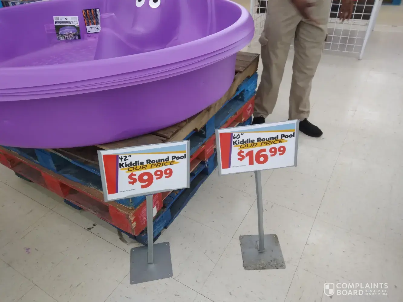 Manager was very rude, never apologized and fussed at me about the 2 price signs and sisnt know how the signs got there cause at register pool rung up 25.00 dollars but clearly the 2 signs are there, and one sign stated 60"kiddie pool hmmm nad the black and white bar code shows that purple pool is a 60". The manager owes my self and grand child an apology...