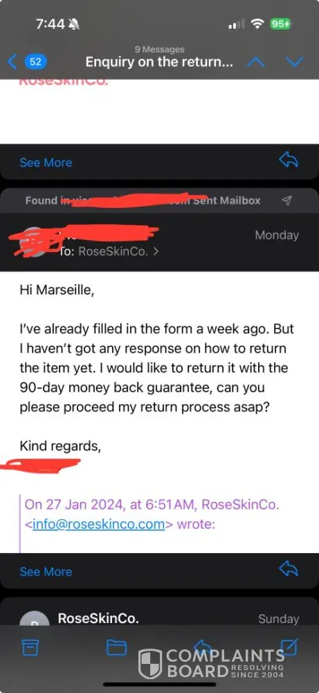 I ordered a Lumi handset from RoseSkinCo on 23 November 2023, it arrived on 4 December 2023. I would like to return the item under the 90-day return policy due to dissatisfaction on the product and filled in the Satisfaction Guarantee Form on 23 January 2024. Then I received a confirmation email of the form submission, with a message of “Our team is on it – we’ll review your inquiry and a member of our team will get back to you within 48 hours.â€. However, I’ve waited for 3 days but there’s still no response from them. So I sent an email to info@roseskinco.com to check out the status of my return process.