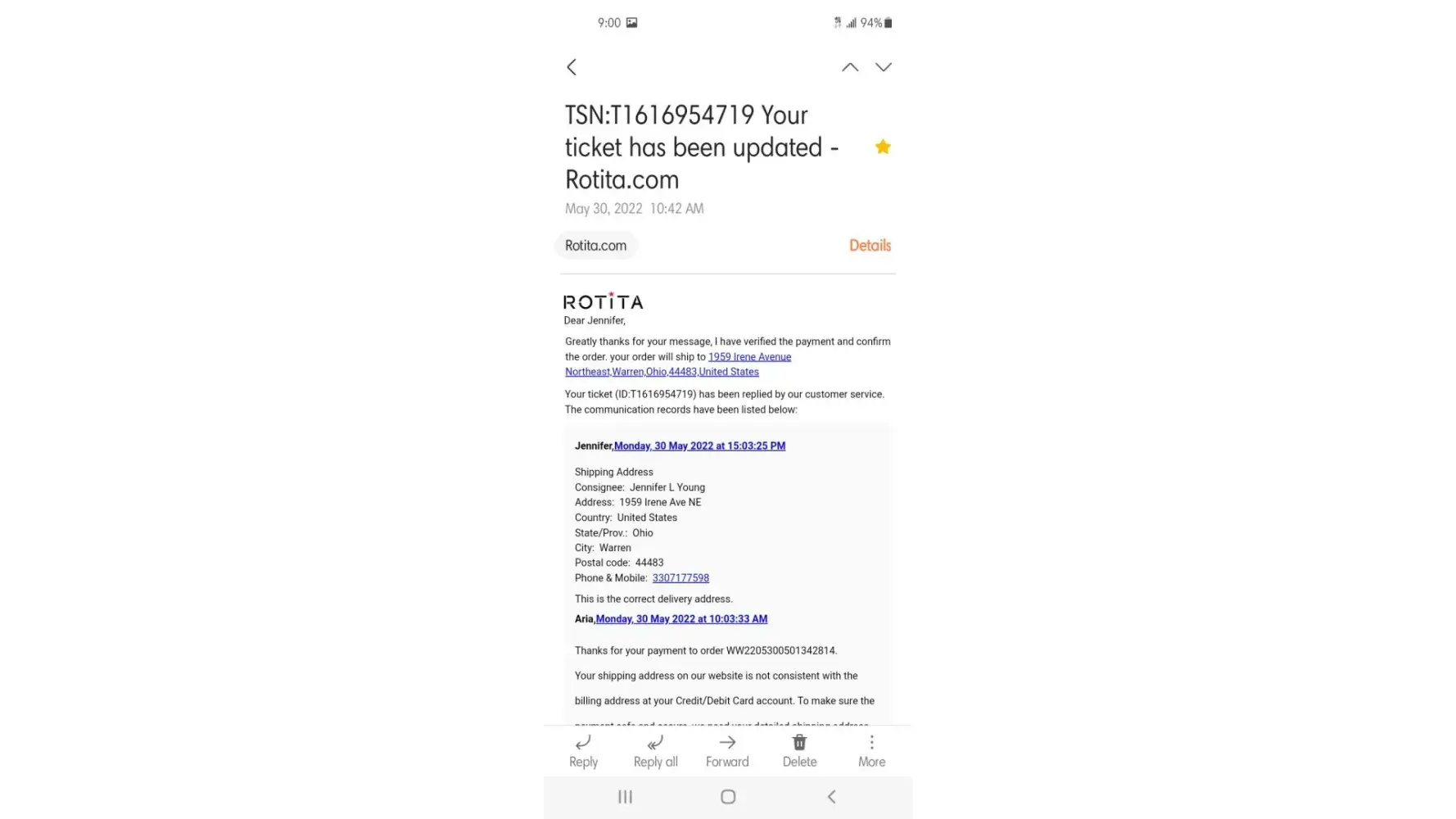 I am going to post here a thread of the "Customer service" I have gotten on an order that was placed (the shipping company contact is USPS who doesn't have the package from their shipping partner that Rotita uses: