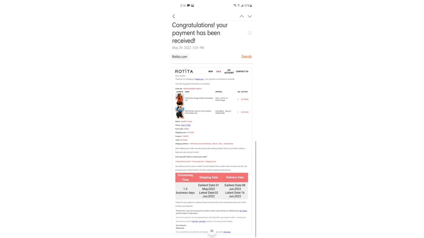 I bought 3 swimsuits from Rotita; I sent all three back in one package just like I received. Once I had the shipping information, I updated the ticket for the return. UPS gave me an expected date of 07/01/2022. I checked the delivery tracking through UPS, and it was delivered on 07/01/2022. SINCE Rotita can't process returns within a timely matter or stamp the return when it was received; I'm out of my refund because it took the 19 days to process which put my return over their 30-day policy...what a bunch of BS! Not my fault they don't document when the package/shipment was actually received/delivered when they get it! DO NOT WORRY...I OR MY FAMILY/FRIENDS WILL NEVER ORDER FROM THIS COMPANY AGAIN. I'll definitely get the word out; especially now since people are stripped with budgets.