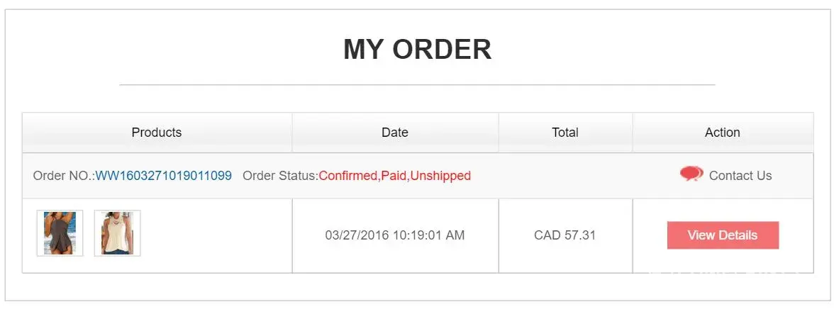 I ordered a bathing suit on Rotita's website on 3/26/16. I received an order confirmation that same day. I had not received a shipping confirmation, so I went online to check the status of my order on 4/13/16 and it had not shipped yet! I sent an email to them asking why my order had not shipped, did not get an answer, and then got a shipping confirmation the next day. When I received it 2 weeks later, the packing was horrible, the "packing slip" sticker on the package said the wrong item. The quality of the item was so cheap, the sizing is not right, and it looks nothing like the pictures on the website! And it took a month to receive it!