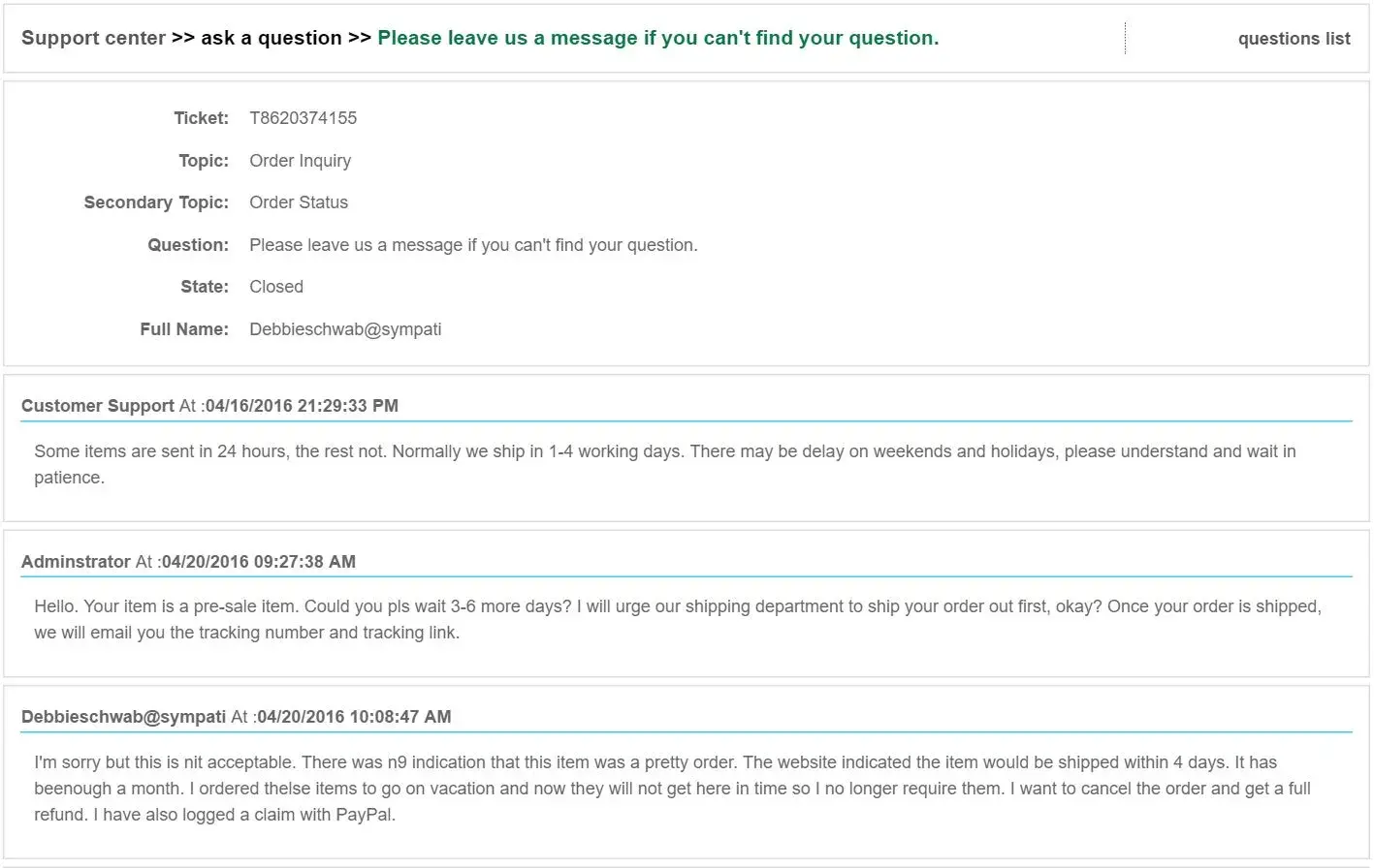 I ordered 2 swimsuits April 9, 2016 it is not May 10, 2016 and still have not received them. Submitted several ticket numbers about my order. Complained on several sites. Still no response. I even called the number provided left a detailed message still no response. I would like a refund, but don't know how to go about getting it back through paypal. Should have known better to order from CHINA! I am a very pissed off customer. They have my money and I have nothing. If I knew where to turn them in I would. W1604090500076590.