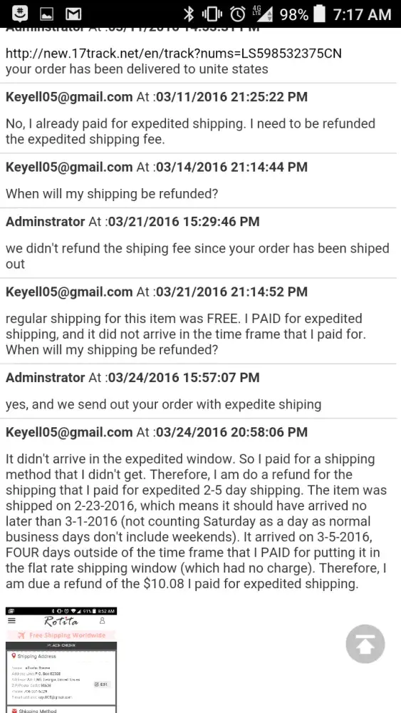 When trying to resolve problem: only by e-mail, bad English, terrible understanding, told would only receive 60% refund and I have to pay postage. I DO NOT RECOMMEND THIS COMPANY!