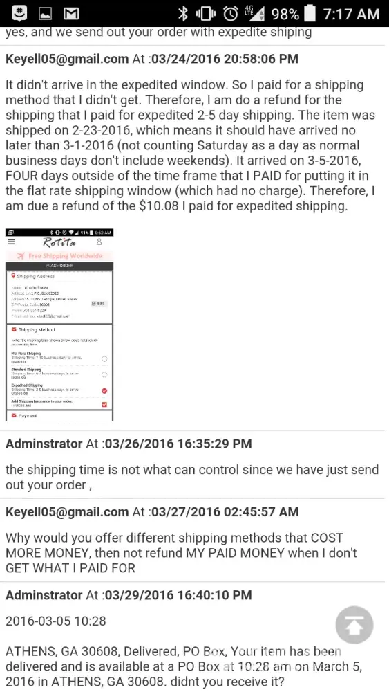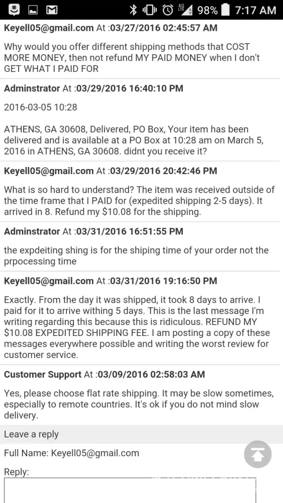 I have been in constant contact with them and have not received any of the products still! If i don't receive my products soon I will be contacting my bank and letting them know the services have not been rendered and contact paypal (customer rights). I have all my proof. I frequently do business in China and have received many other products from different companies and still was not this bad. I am further annoyed because the products i ordered stated it will be shipped in 24 hours. Granted the Chinese golden week was when i ordered it but March 3 it should have been shipped and i was supposed to receive it by now. Shipping does not go by business days so saying that is pure bull. Keep in mind i spent over $100 people and this was my first order that i didn't even use the coupon on.