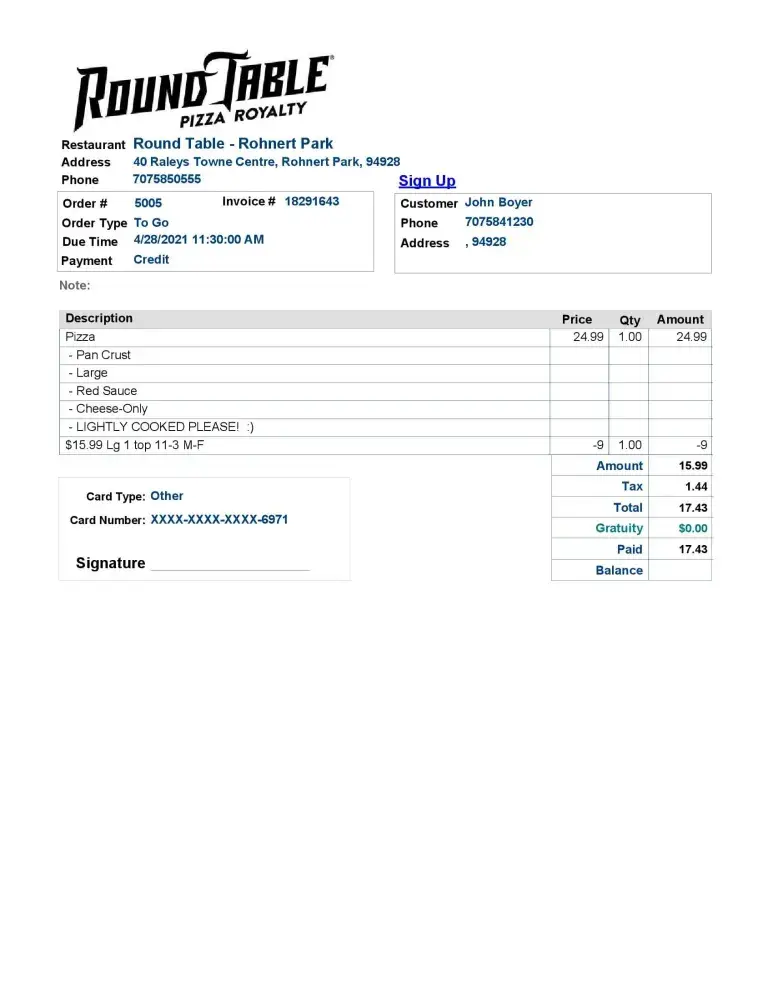 I will definitely tell all my family, friends & coworkers not to dine/order from ANY Round Table Pizza Parlors. How many others shrug off the value of customer service. This location needs to have full staff, including managers take customer bias training!!! On October 7, 2021 @ 8:20 PM, I placed a pizza & wings order for take out @ Round Table Pizza...