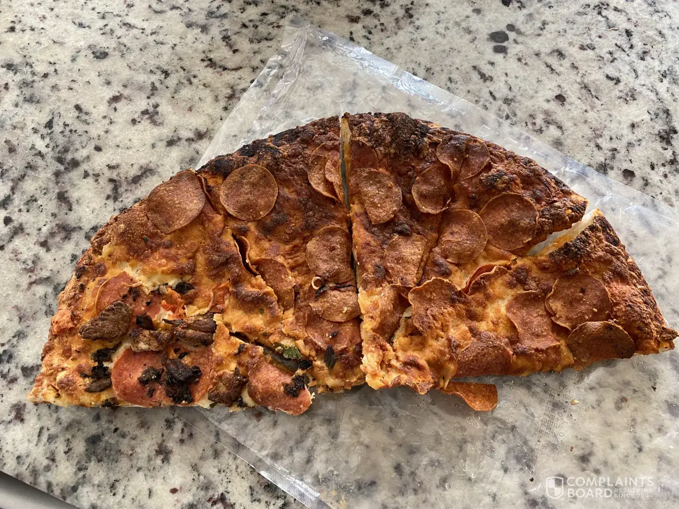 I ordered and picked up 3 large pizzas from the Thornton, CA location last Sunday for a party in my house. The dough was chewy and the tops were burned.