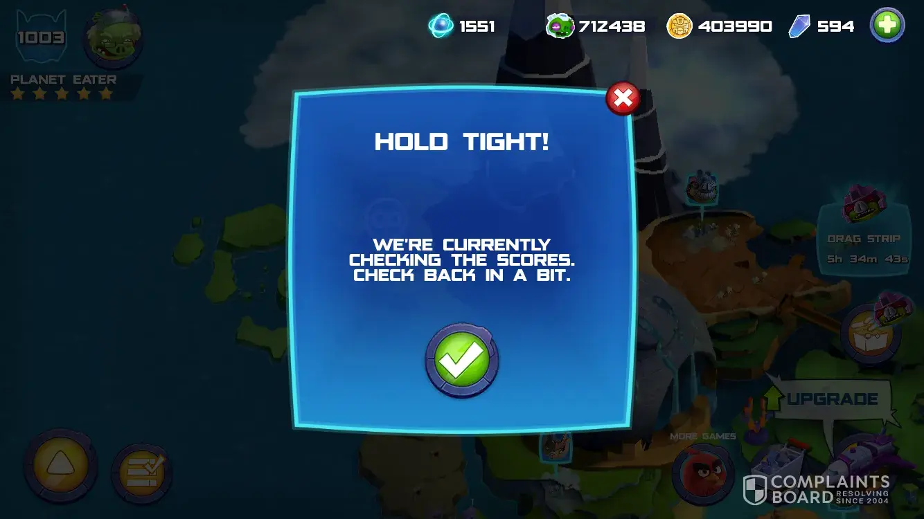 I purchased the devastator challenge run for 2500 gems and used approximately 1500 gems to obtain prizes. The game has been completed and malfunctioning for over 43 hours. There is no resolution for the game prizes we paid for and we earned. The devastator challenge run game is fraudulent and Rovio has horrible game play customer service. We want gem compensation!