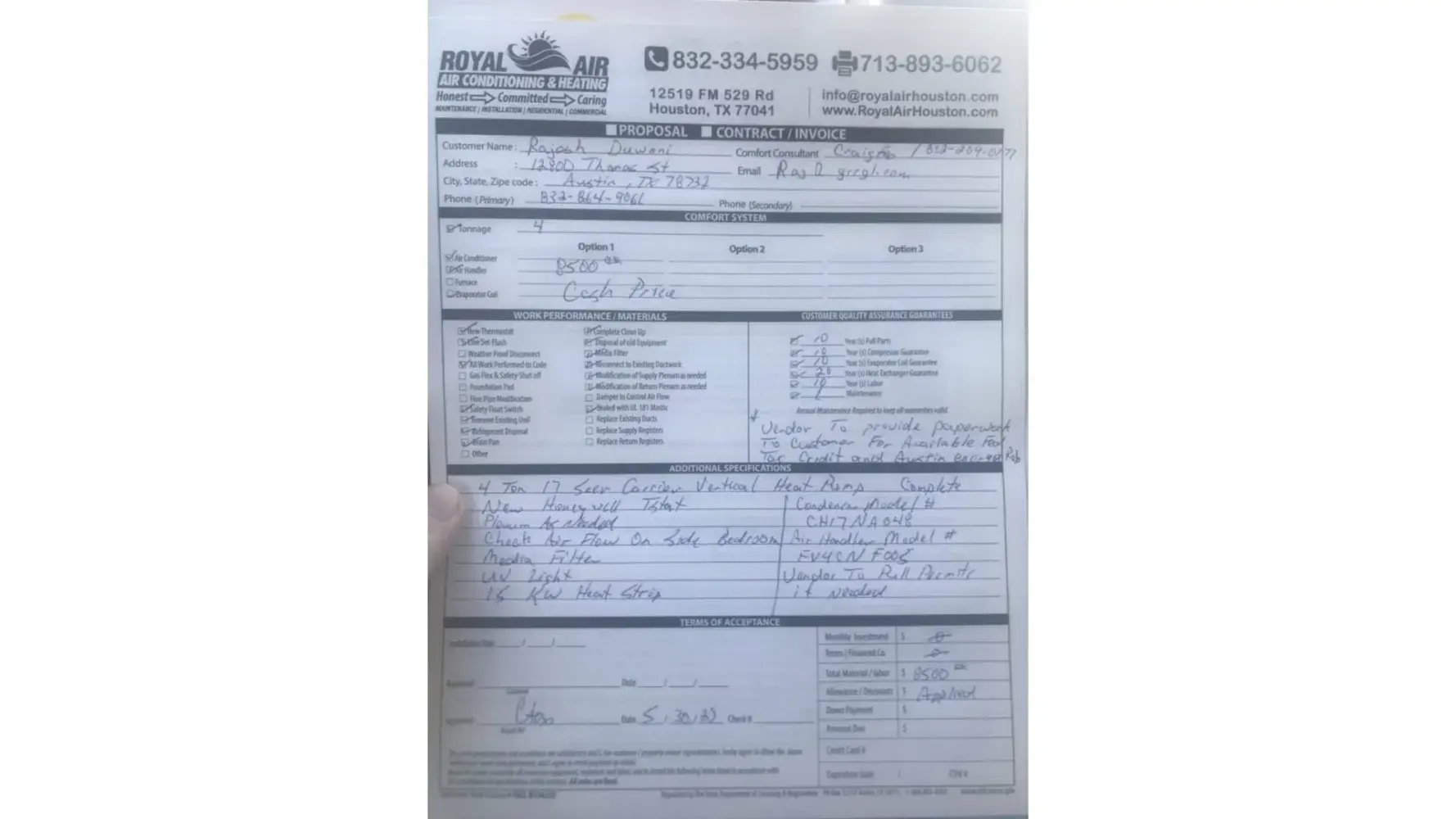 Signed contract for replacement of two AC units and air handlers-a complete HVAC replacement right down to new slabs for the outside units