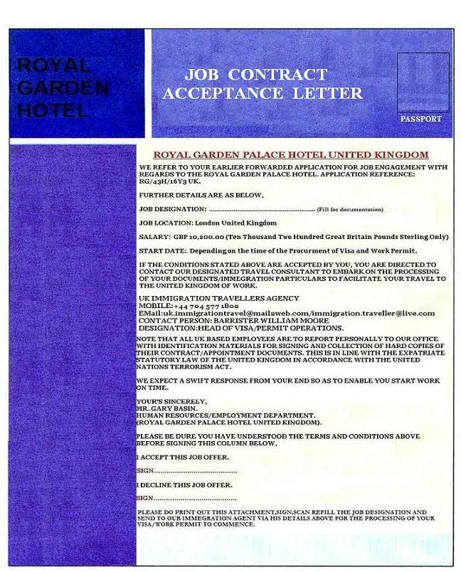 This attached documents embodies the approved terms for the purpose of this contract.You are advice to print out and fill the Contract letter documents sign and return a copy to us via email which simply shows your sign of acceptance of this offer and make contact to this bellow giving visa Agent address for directives and assistance on the acquisition and procurement of your valid residence and work permit papers here in United Kingdom.