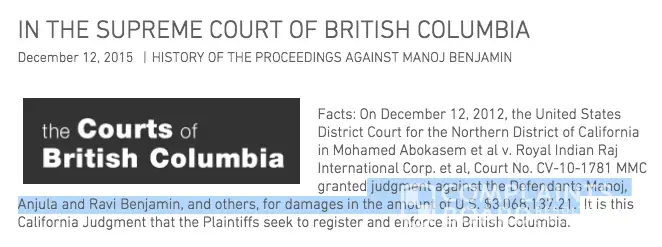 It is suspected that ravi benjamin fled from vancouver bc canada to bangalore india with his wife, sherri vaters after the $30 million defeat of ravi benjamin was petitioned to be registered internationally in vancouver british columbia canada. international enforcement of the ruling is in play, with india and canada having various reciprocal legal agreements in place for execution and enforcement. manoj benjamin and others were also defeated in the $30 million law suit.