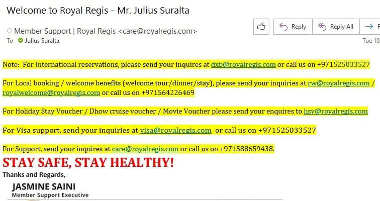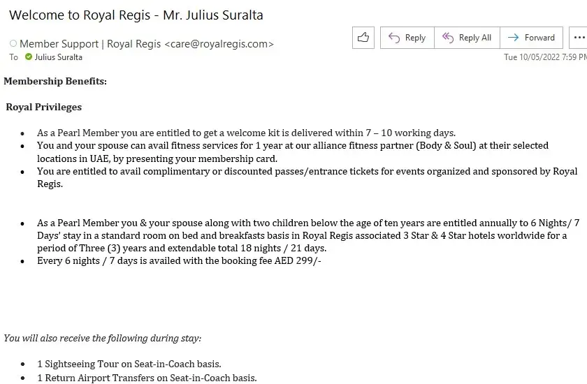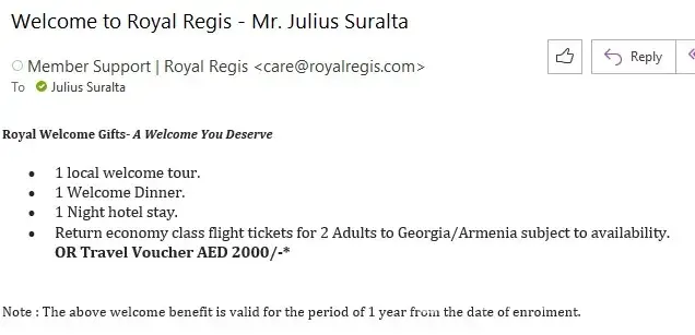 Just like others we also had taken the Ruby package in December 2020 and were promised many benefits for the paid amount however before even we could use any of the proposed benefits, the Royal Regis team started becoming irresponsive from 2022. It used to take days to weeks before they reply to my email, then recently all of my emails were bouncing back. We haven't used any of the mentioned benefits or offers of my package and realized that we have been cheated by them.