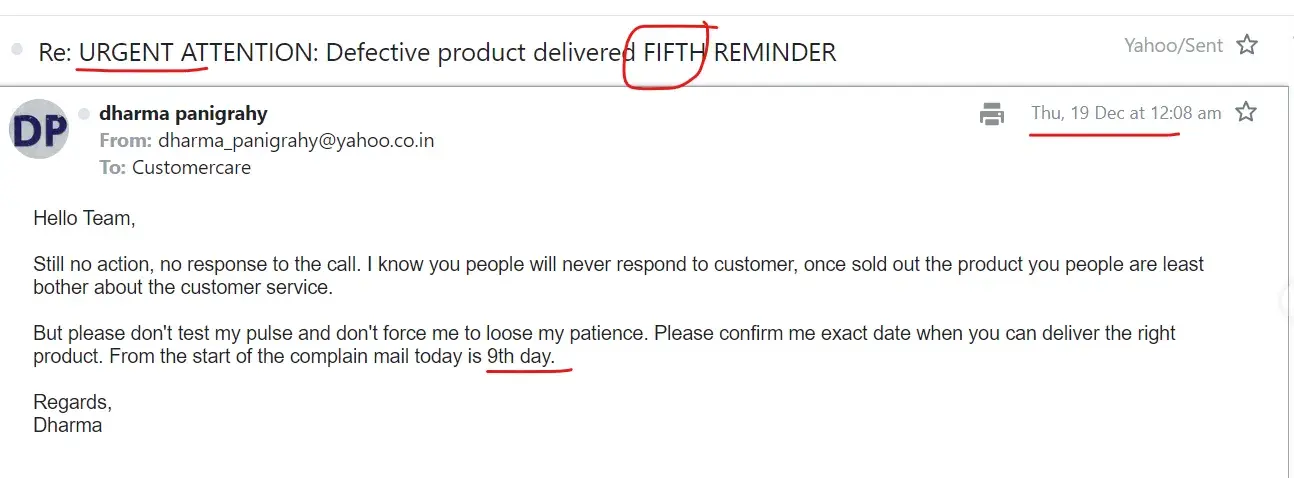 Its already 10th of delivering the defective product but they are not responding neither in call nor over mail. I just told till right product you deliver please take the defective product back as its eating my house space. Attached is the mail screenshot that I wrote them even after that they don't have right response.