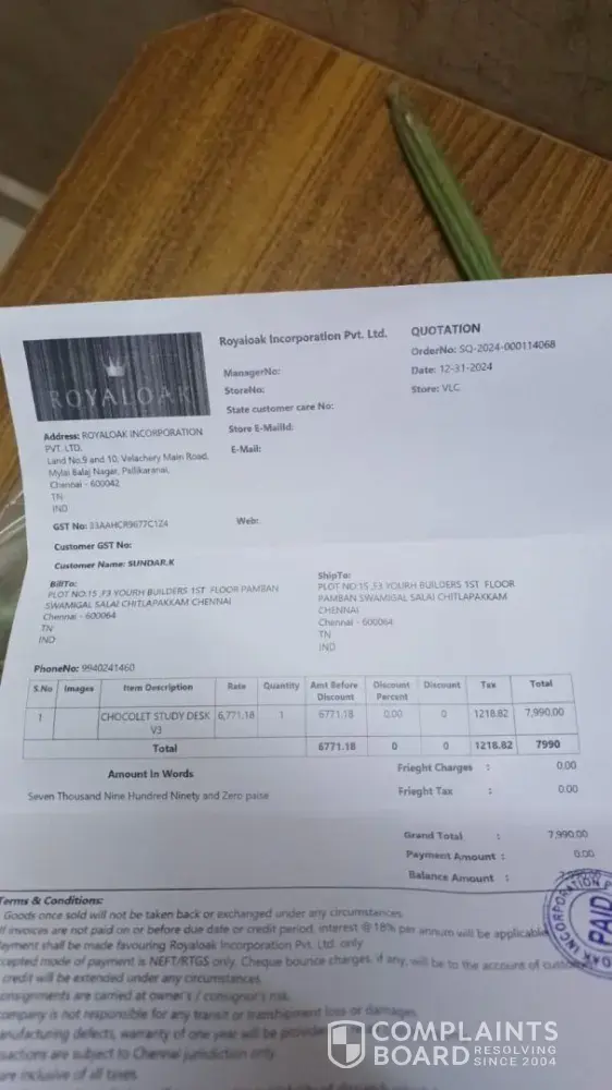 I purchased a royaloak amber computer table with honey brown finish - 1.2 m on 28th december 2016. At the time of payment they said it will be delivered within 48 hours. Since then they haven't called or contacted me. On calling the customer care they said they will not deliver the table, and now they are not responding about the refund.