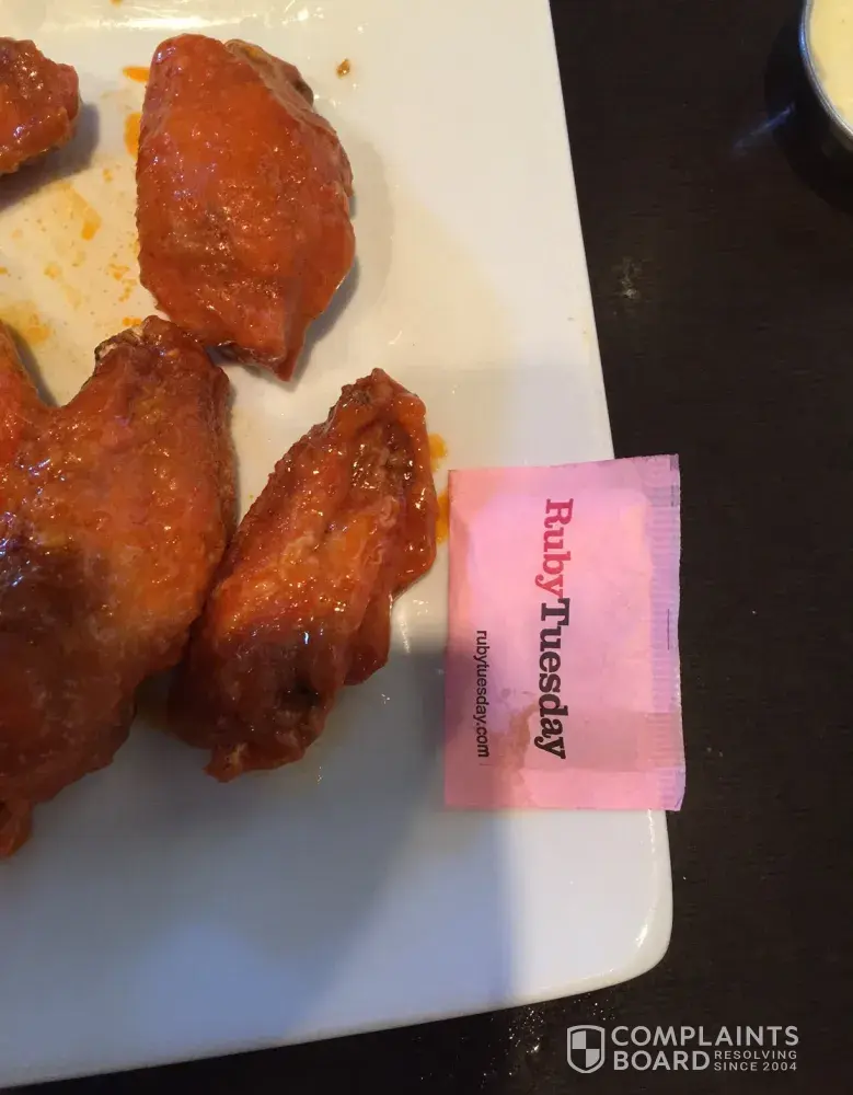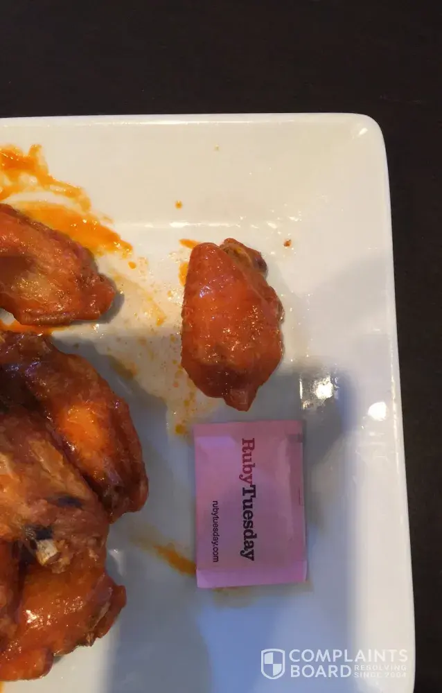 When I said something, the waiter looked at me like I was crazy. That's the way they are'. Oh yeah, then you enjoy them because I won't be coming back. My wife is 61 yrs young and 110lbs soaking wet. She eats like a bird and was still hungry after eating these wings. Which never happens at Ruby Tuesday(usually).