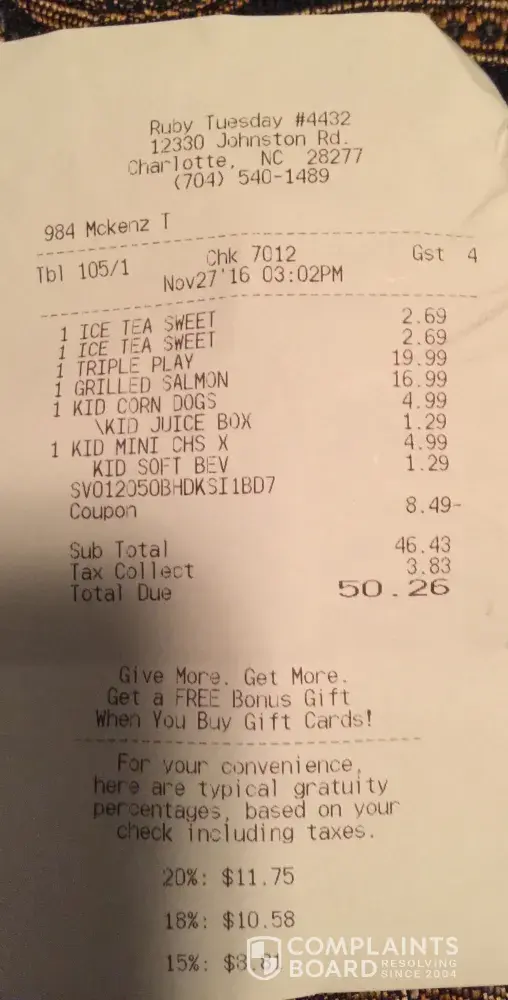 My husband and I went to Ruby Tuesday on 12/01/16 after a busy day at work, We've been at this restaurant several times never a problem, today on the other hand was the worst ever the server (1328) was also the bartender which took forever for her to acknowledge us, she comes over not friendly at all, she's like you ready to order, not what can I get you all to drink, my husband and I order, another server brought out our dinner, no refill on the drinks not even how's everything tasting, can I get y'all anything else, enjoy nothing, we ordered the 3 course meal @12.99, my husband ordered the half rack rib, she says what two sides he says ff and she like you get one more side he's like what other side do you have she says broccoli, zucchini, Mac and cheese, my husband says ok Mac and cheese. She took forever and I mean forever, she's like ok dessert brownie or tart, we both said the brownies that literally took about 45 minutes to get we got the check and she notice we still haven't got our dessert mean while other severs were coming out of the kitchen with the brownie dessert, anyways my point is I really would like a refund because we received horrible service and not only that she should of informed us that the Mac and cheese was going to be an extra charge on the bill not even that she did. Never again will I go to that Ruby Tuesday, I would drive to another RT.