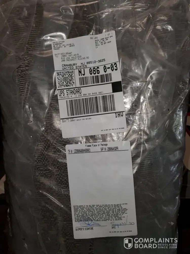 Problem description: We ordered 2 rugs from this merchant. They were the wrong size. We decided to return them which was within compliance with their policy. We received a return authorization number for each rug (after asking 3 times). The return authorization email gave the following instructions: ----------------- Thank you for shopping with House Accents / Rugs USA, we are sorry that you are unhappy with your purchase. Please follow the steps below carefully, to ensure a full refund of the purchased item. If you have any questions, or need assistance, please contact Customer Care at [protected]. The Return Authorization number for item(s): 200ACR129G-609 RA#: rugsusa-####### 200SBHAC13A-609 RA#: rugsusa-####### The return address for this item(s) is: Rugs USA.com 8 Santa Fe Way Dock # 12 Cranbury, New Jersey 08512 • Re-package your item using the original packaging material or equivalent form of wrapping that will protect the item during shipment. Label the package with the Return Authorization number above. • Mail your package to the address listed above. Use a carrier that will provide you with a tracking number such as UPS or FedEx. We highly recommend that you insure your package for its full purchase price with the carrier you select as we are not responsible for loss or damaged merchandise that is returned to us. In addition, you are responsible for filing claims with the carrier you use in case of loss or damage. • Once you have mailed your package, forward the return tracking number to [protected]@rugsusa.com. Please include the Order number, Name on the order, and Return Authorization number. Be sure to save your shipping receipt and tracking number in case we have any questions. Return credits may take up to 15 business days to process. If we do not receive your tracking number we are not responsible for any delays in processing your credit. Return labels: http://www.rugsusa.com/rugsusa/rugs/rugs-usa-electronic-label Notes on Returns • You have 7 days to return your item from the date you are issued the return authorization number. • Do not fold, staple or tape any surfaces of the item. • Returned merchandise must be in new, unused condition. If an item is soiled or damaged it may be refused or incur a 25% restocking fee. • Rug pads that have been opened may not be returned. • No returns will be accepted without a return authorization number. If an item is received without proper authorization it may be refused or incur a 25% restocking fee. • Returns that are shipped to the wrong address will incur a 20% service fee Kind Regards, Rugs USA Customer Service ------------- We live in the area so we decided to drop if off directly at their location. We attached the proper RA numbers to each rug, drove to the above address and left them with 2 friendly employees who assured us that we were doing the right thing. We even took a photo of the rugs, dock, and employee (JUST IN CASE). We received an email back stating that 1. there were no employees at the warehouse (there was no other business at that address) 2. There were no rugs with return authorization numbers (they were clearly marked) 3. That we were not supposed to drop them off ourselves so even if they do find them Rugs USA will only give us 75% of our purchase price. We will be taking further action to recoup 100% of our funds. BUYER BEWARE.