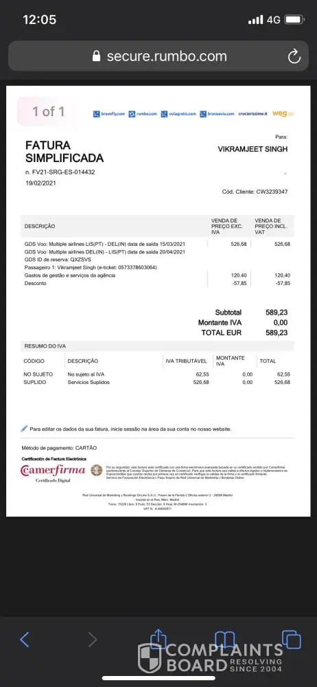 As soon as we open the link, another link appears saying "select refund mode". By clicking on that link, it automatically indicated that the refund would be made through a voucher (there was no other option!). Given this error, we immediately called customer support, who assured us that we would receive the full amount via bank transfer if we wished so! However, we received an email with a voucher for €122.20, which was €112.20+€10 for the error. Since we were going to book another trip through Rumbo, because we didn't feel like bothering again with errors related to the voucher/bank transfer, we accepted.