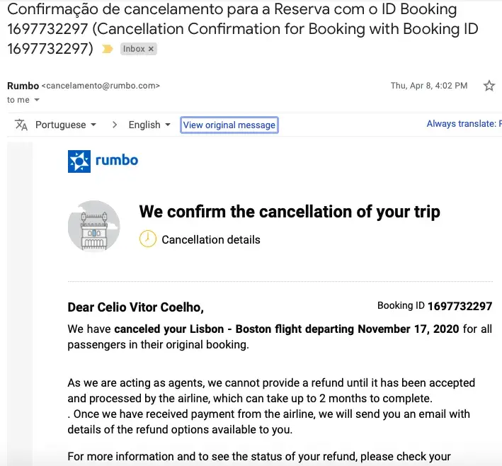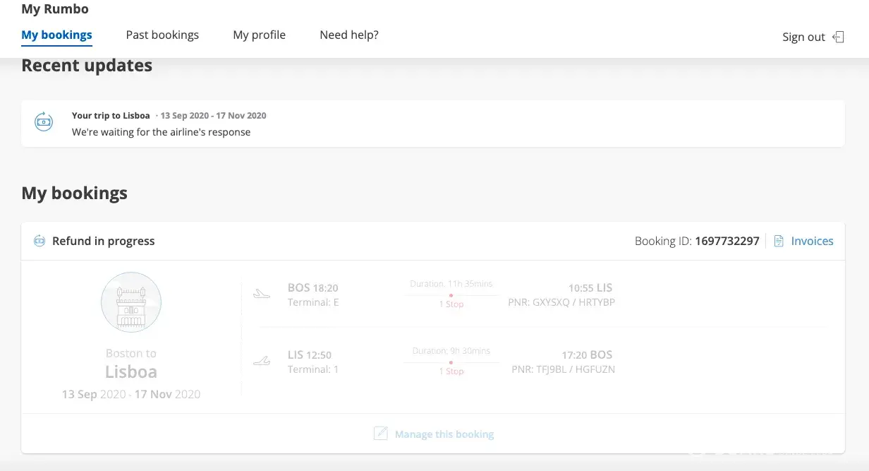 - I purchased return flights from Boston to Lisbon on the 10/09/2020. My return flight was cancelled by the airline on the 12/11/2020, with Rumbo stating they have no option but to give me a refund (pics attached). This ticket was purchased with an extra baggage allowance and insurance.