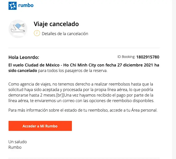 - After never receiving a follow up, I call Rumbo once again and only on 08/04/2021 did they finally confirm my cancellation and that it can take up to 2 months to get the refund