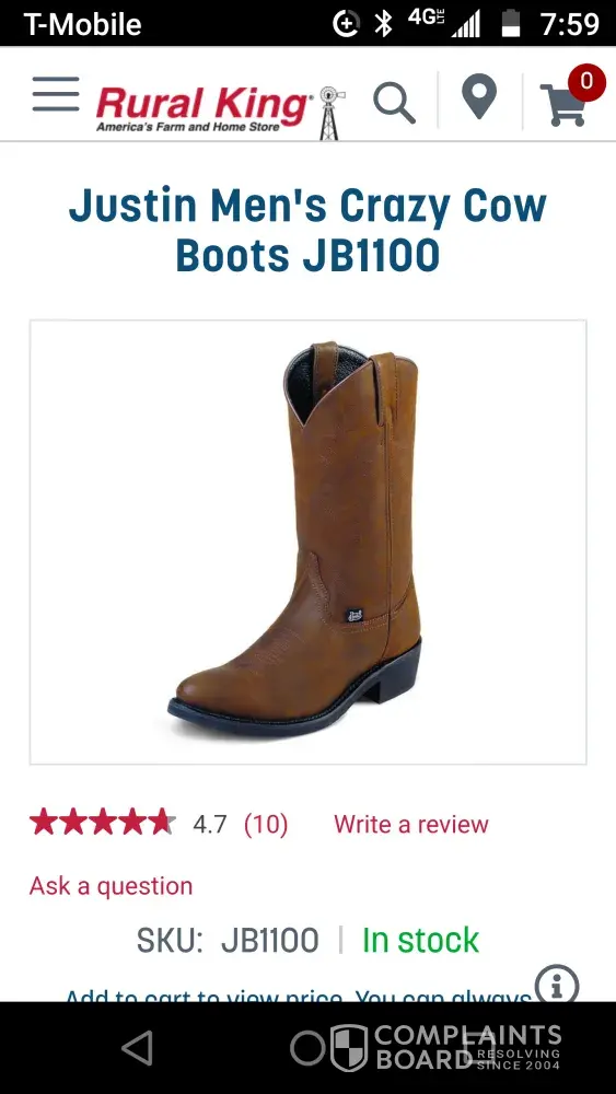 My complaint is the same as most every one else. Said in stock so I ordered the boots and now going on three weeks still no boots. It still says in stock online. They sent an email and said they are out of stock. Bad bad company. If it is out of stock state this online so other's will not be frustrated as I am. Many complaints all with the same issues even on BBB website.