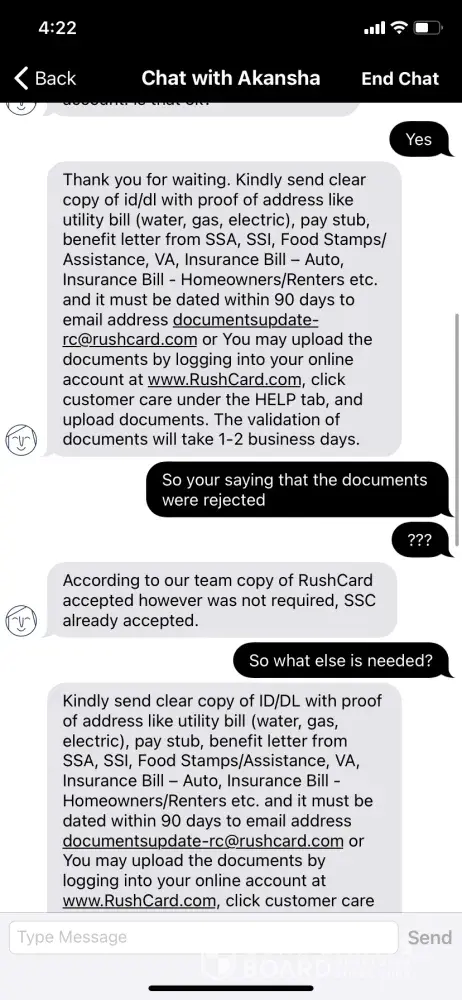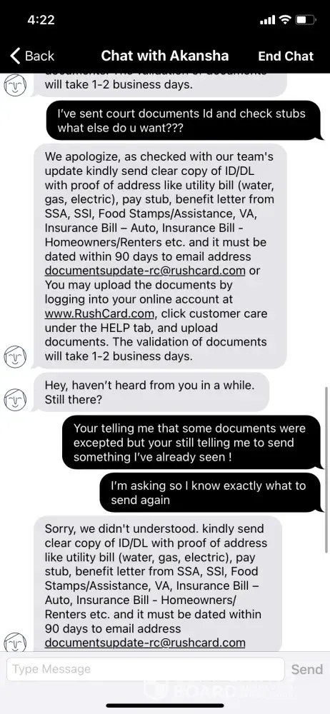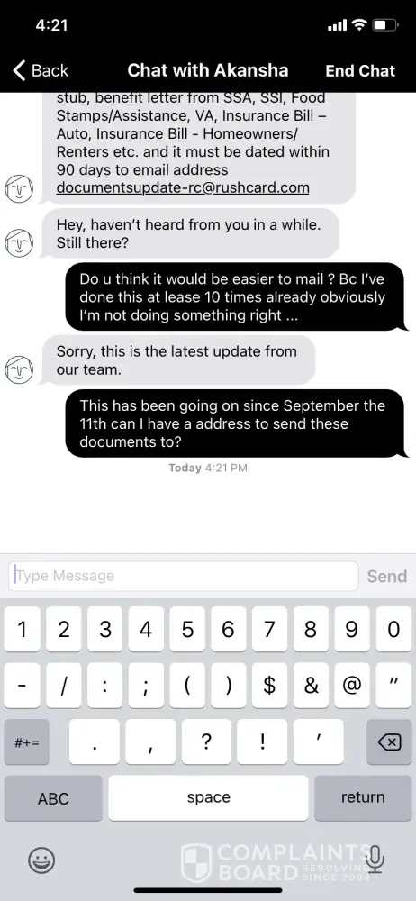 Read full complaintRush card keeps rejecting documents to get a replacement card