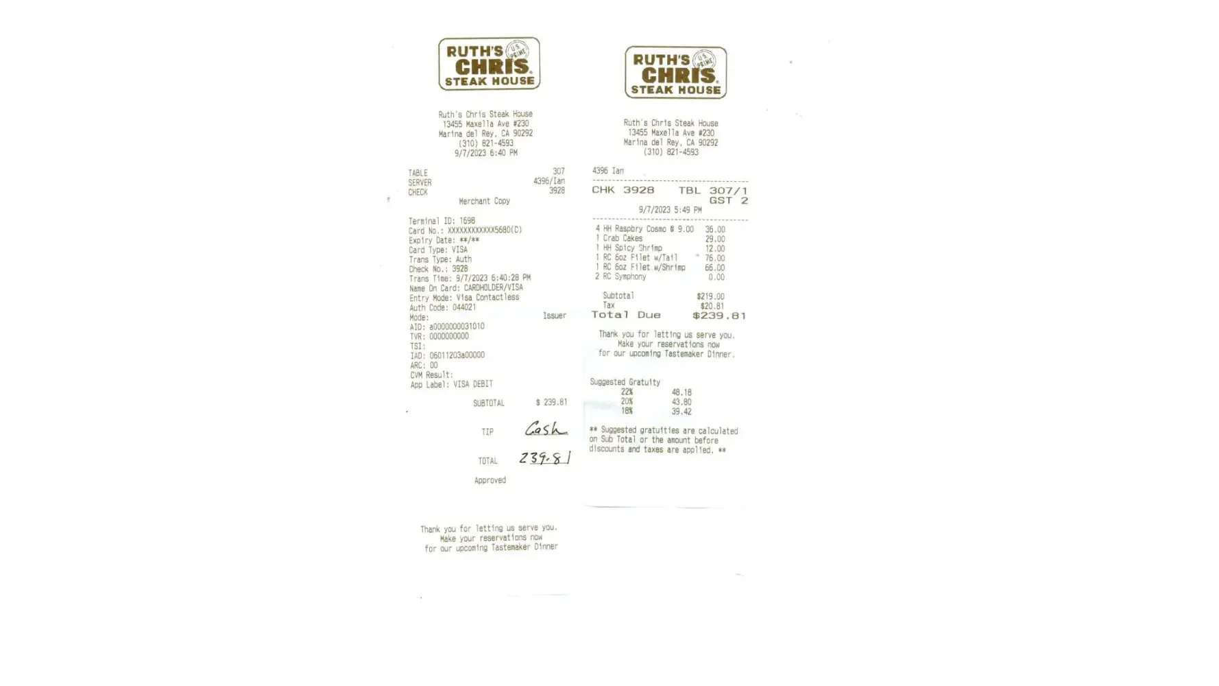 RE: Check 9475 on June 01, 2023 (four Guest and not three as reflected on receipt) Hi I have been a customer of RUTH CHRIS for decades throughout the United States and Canada. And the vast majority of my dining experiences went well. However, I would be remiss not to mention June 01, 2023, at your 3285 Peachtree Rd NE Atl, Ga 30305. Things did not go well...