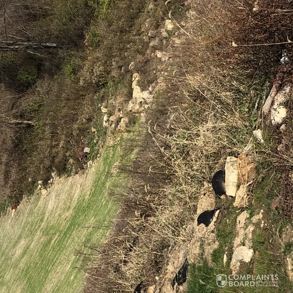 ​In addition to the yet-to-be-addressed issues, there are new problems with our "new" home. Our backyard hillside is still full of debris such as plastic, boxes and a multitude of other post- construction garbage that was simply thrown over the hill and forgotten about. This needs to be addressed immediately as there are also decaying tractors and rusty farm equipment well within reach of the neighborhood children.