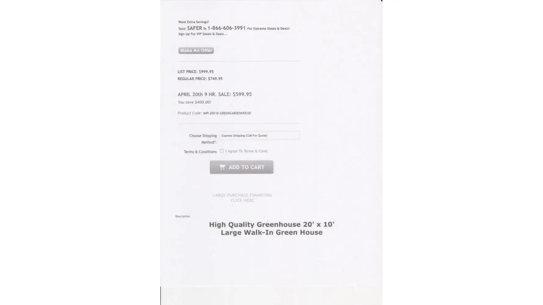 I ordered High Quality Greenhouse 20' x 10' Large Walk-In. After receiving the product I was shocked: instead of promised two doors there is one door. The size of pipes are very small or even tiny and absolutely different shape. The greenhouse should be the same as in the photo and in your description. When you return, you yourself make sure that you sent me anything.