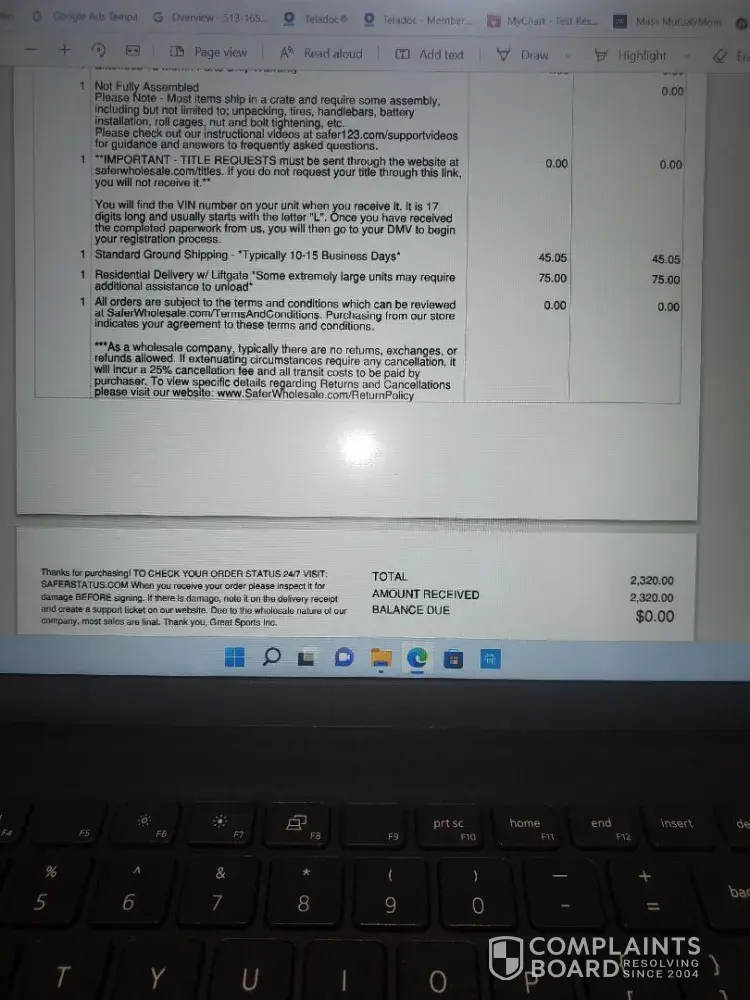 Safer Wholesale has stolen my $5,295.95 and I must take them to Small Claims Court to get it back!!