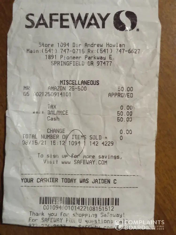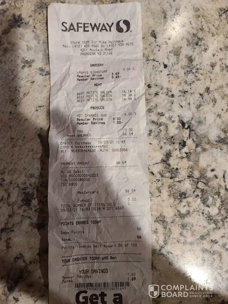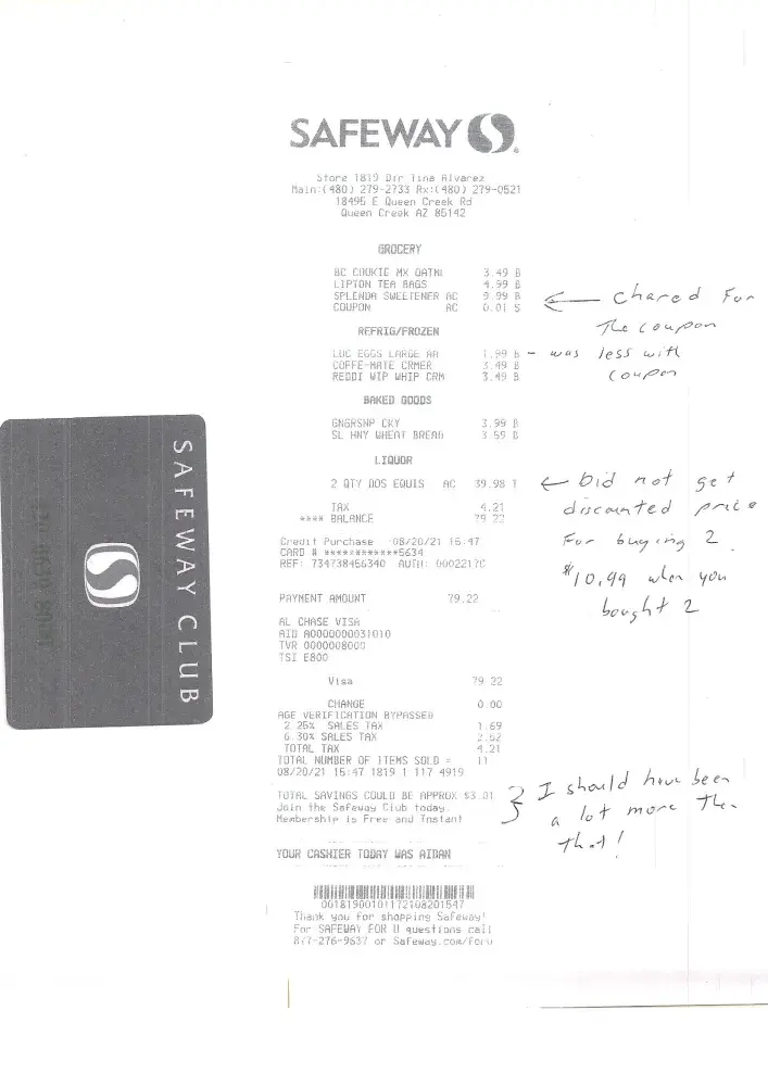 On 08/20/2021 I purchased a number of items at the Safeway store # 1819 at 18495 E. Queen Creek Rd, Queen Creek, AZ 85142. At check out I showed my Safeway discount card to the checker, who verbally said he got it! Several of the items where on sale with discount card and I had one coupon for eggs. You will notice I was charged 1 cent for using a coupon! and the Dos Equis beer, was full price, even though I bought 2 cases as per that weeks ad.