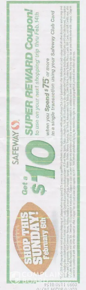 Safeway is handing out "$10 off on your next $75 purchase" coupon. The casher handed me the coupon with a receipt. I returned to store and bought $90 worth shopping. When I handed the coupon, the casher said "This is not a coupon. This is just advertisement. The real coupon looks exactly the same, but has a bar code on the side. You are not the only one who thought this was a coupon." I read the coupon again and again, and no where it says "This is NOT a coupon." It looks exactly like a coupon. Safeway is luring people into their store with a fake coupon.