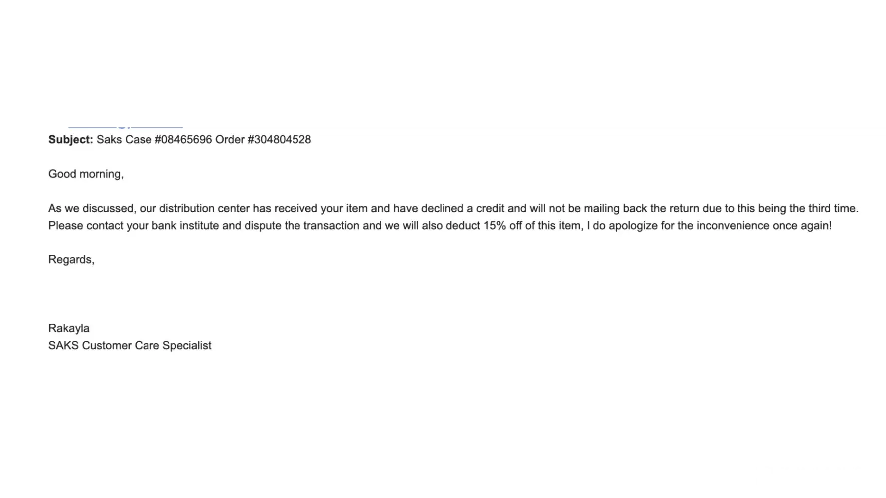 If Saks was one of those brands with just consonants in its name at Amazon or AliExpress, I might be like, okay. Shady practices, very substandard customer service. You might expect that quality of response. Saks? Competing with Neiman Marcus and Nordstom?