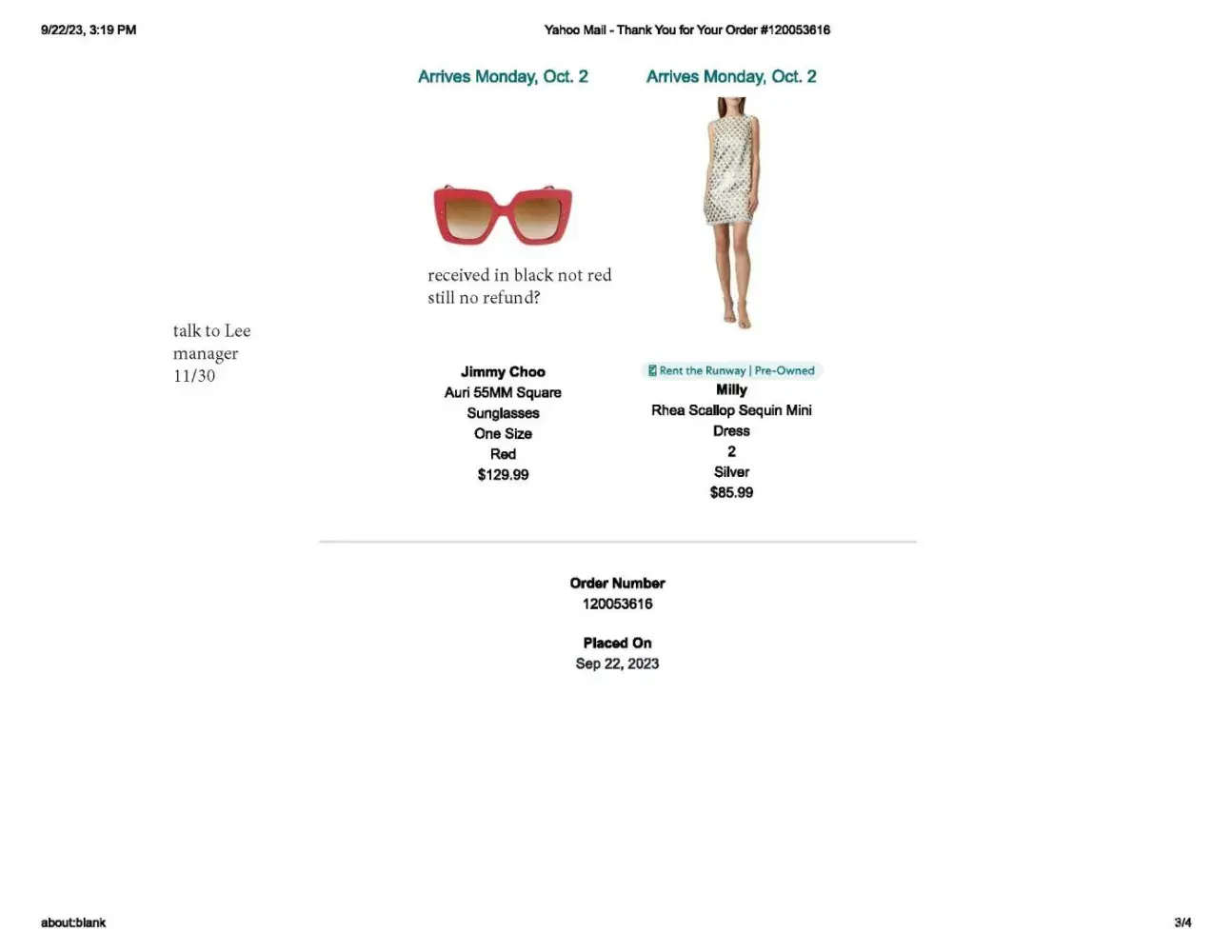 Re: Refund for Wrong Delivery Item Order Number: [protected] and [protected] Dear Sir/Madam, I am writing to address an ongoing issue regarding a recent purchase I made from your store. On September 16, 2023, I placed an online order (#[protected]) for six items, one of which was a pair of red sunglasses. Upon receiving the items, I discovered that the...