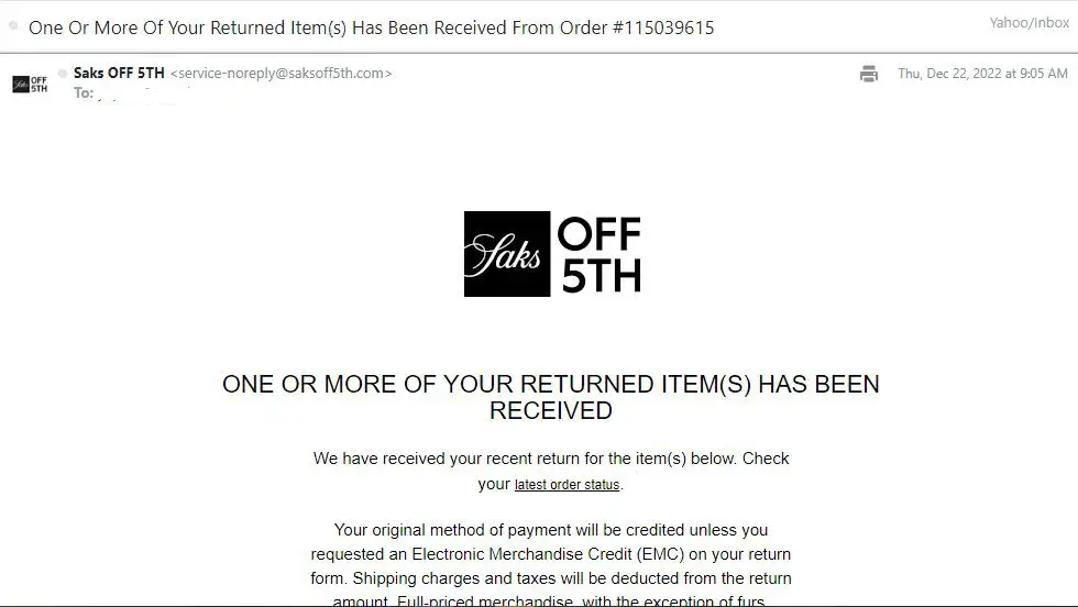 Several conversations with customer support for returns with Saks Off 5th [protected]).