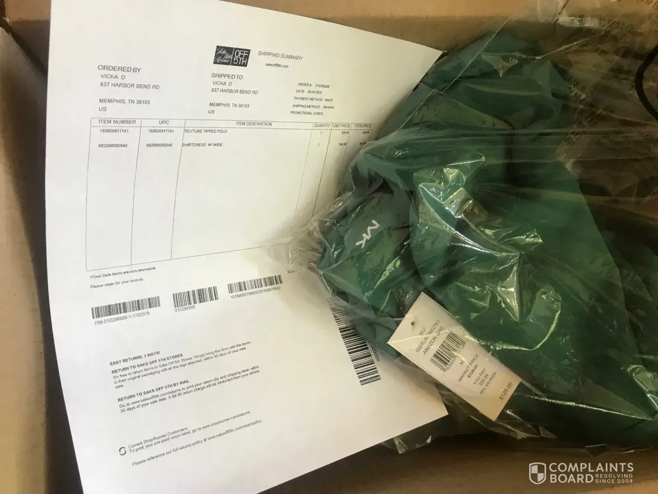 Saks OFF 5th incorrect items shipped (2 orders) and no credit shown not did they try to correct the issue