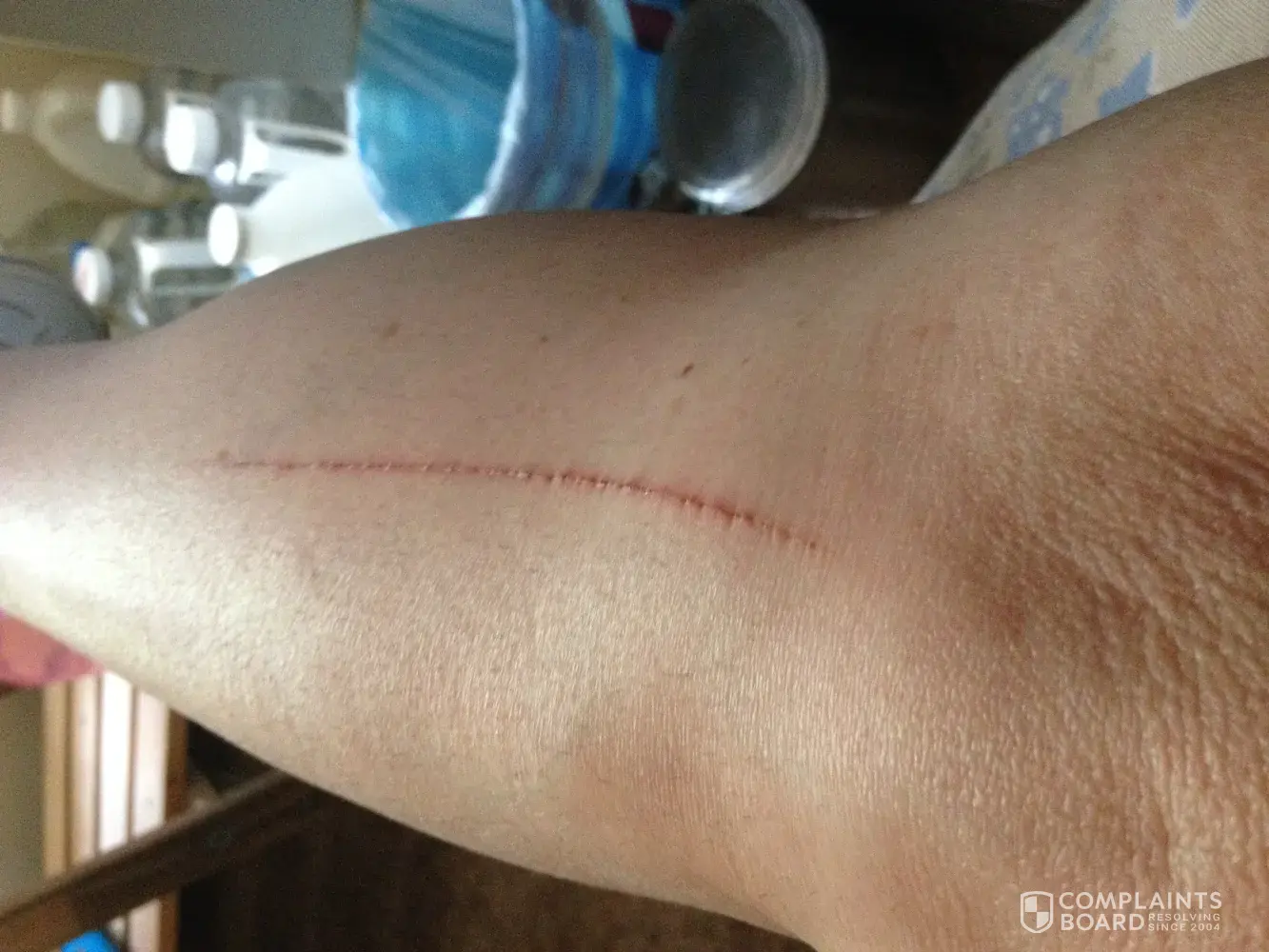 I went into The Salvation Army on May 26, 2015 to purchase some clothing. I found several items that i liked. I went into the fitting room to try on a couple pair of capris and the tag that is STAPLED on the waist band of the pants was not pushed down, it was sticking straight out. I did not realize this and when I was trying the pants on, the staple cut into my leg. I don't think they should be stapling the tags on to the garments. this is a real safety hazard. The photo is of my leg just below the knee. I think something should be done about this procedure of attaching the tags to the garments, so it doesn't happen to anyone else.