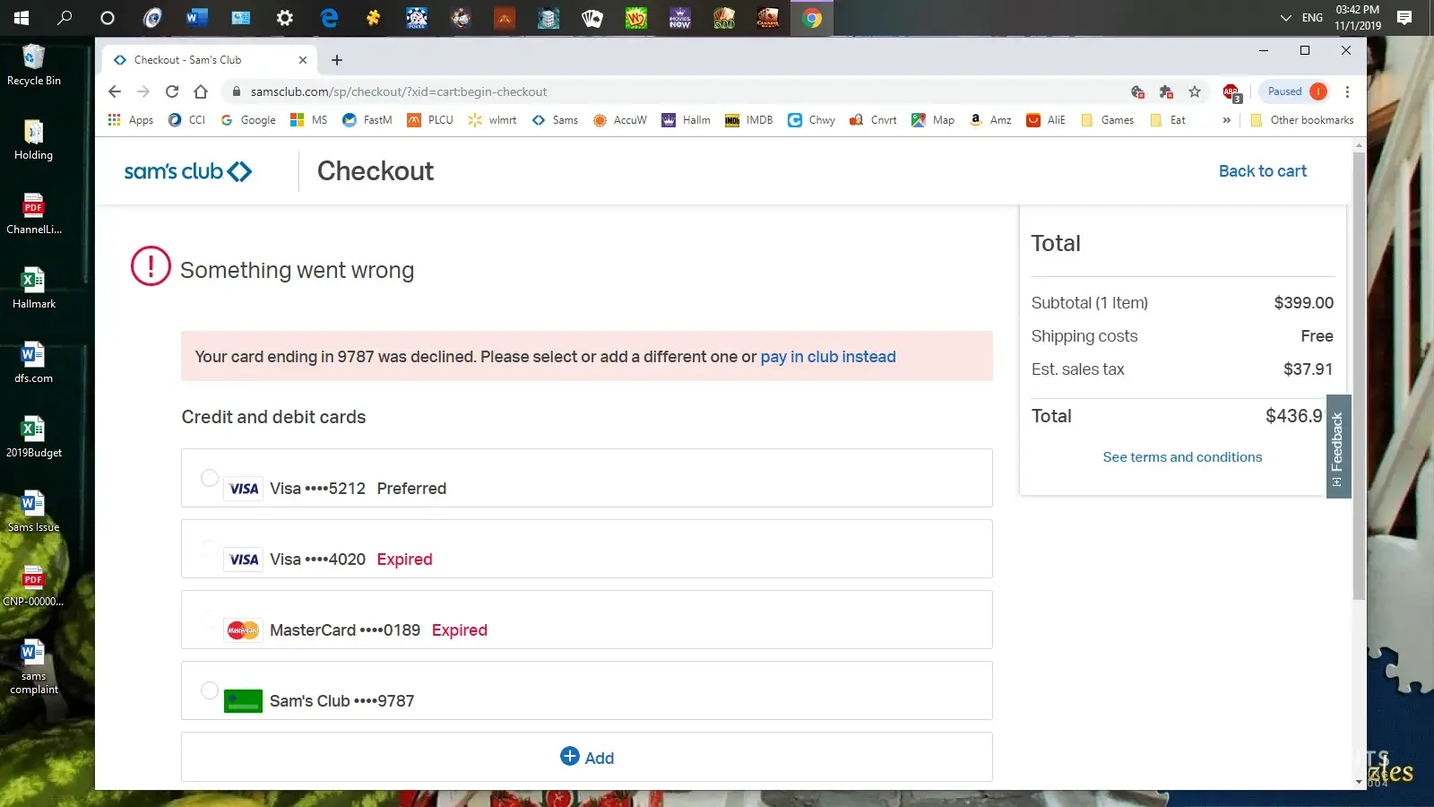 1) I do a "click-and-pull" order monthly. I create the order before my monthly check comes in so I can pick up the order as soon as my check deposits. I want the ability to "pay in store" however that is not an option. In order to make it an option I have to "game the system" by choosing one of my credit/debit cards that will be rejected. At that time I get a message saying my card was rejected and one option given then is "pay in store". I believe that the option to pay in store should always be available. Also please note that when changing the payment source the first one remains checked effectively splitting a payment. If people do not notice that they may be unhappy later.