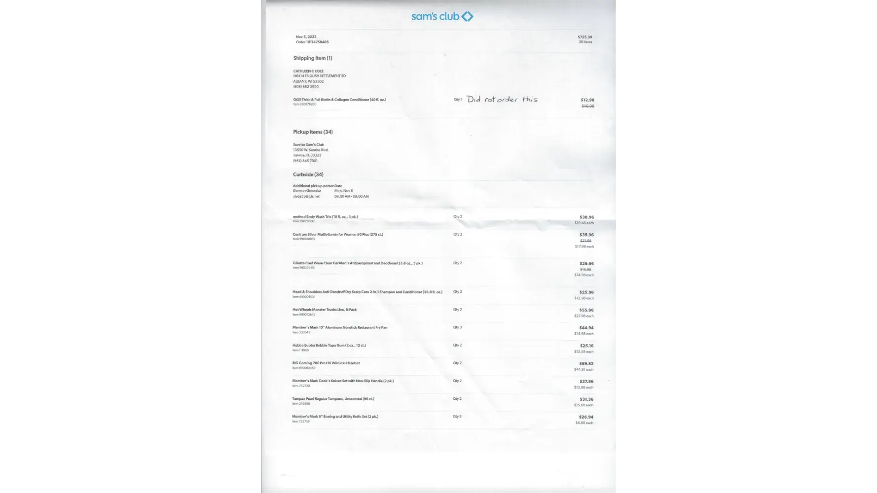 On Sunday November 5th someone stole my information and purchased $725.90 worth of merchandise at Samsclub.com in Sunrise Florida for curbside pickup. I live in Wisconsin, wouldn't you think that was a little suspicious. I called right away after I noticed the money was missing. The order said it was pending so they had time to deny this person (German Gonzalas) the pickup. When I contacted customer service, they sent me an e-mail saying they weren't responsible.