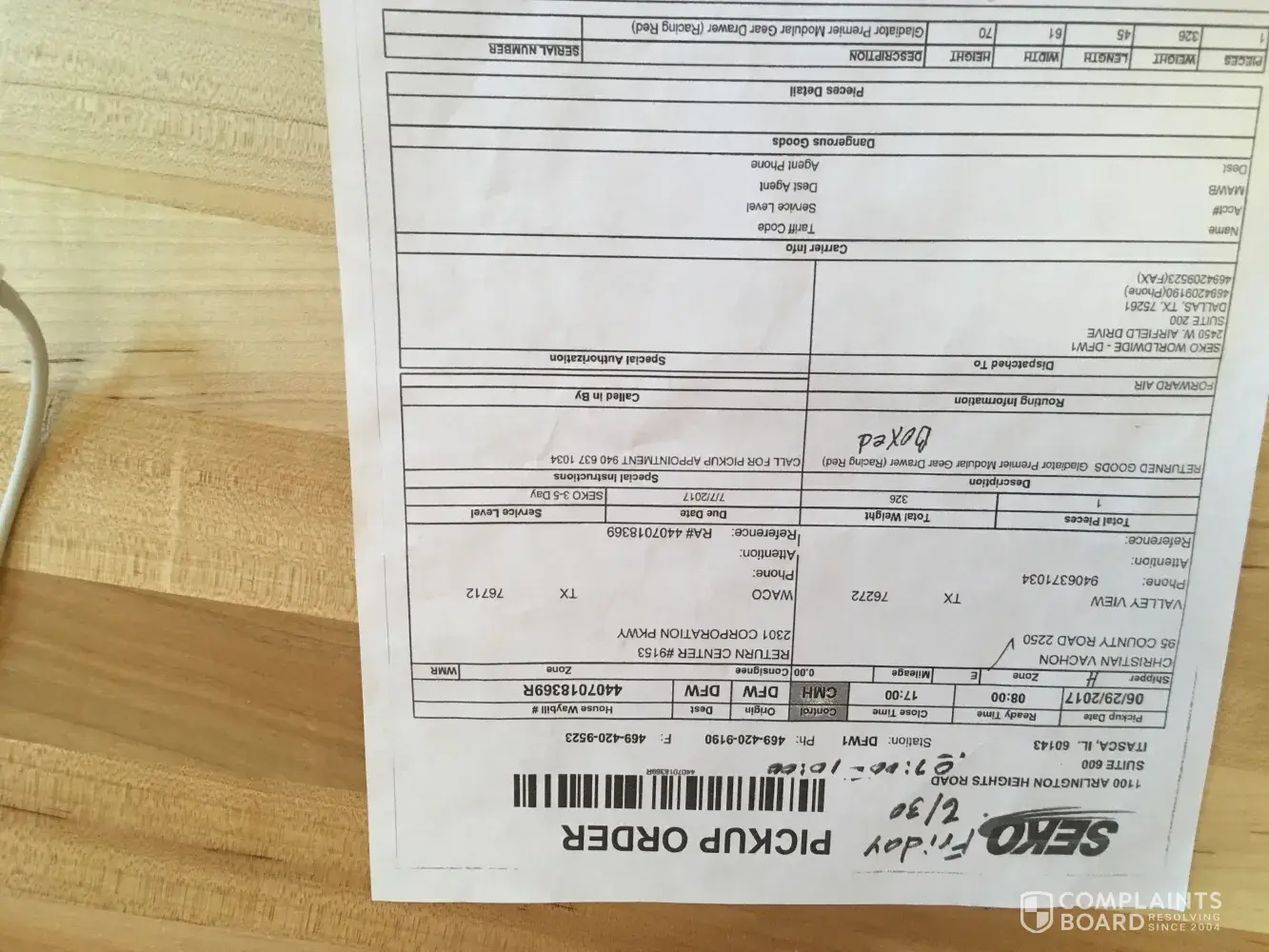 I order 4 things online on may 26th, 2017 (order [protected]). I received on June 12th one gear drawer from my order. On Sam's Club packing slip ([protected]) it said 2 and on seko (delivery waybill [protected]) it said one. So I received and sign for 1. It was damage so I call back and they give me a RA number [protected] and Seiko came pick it up on June 30th on waybill 4407018369R and they send me another gear drawer to replace the broken one. On July 12th I call back because I was still missing one item from my original order, the lady call Seko and found that Sams Club had ship 2 but Seko only delivered one. She was supposed to call me back to find the missing one and she never did. I call three different time after that over 2 month and after I tell my story, they put me on hold to check and at some point They hang up each time.