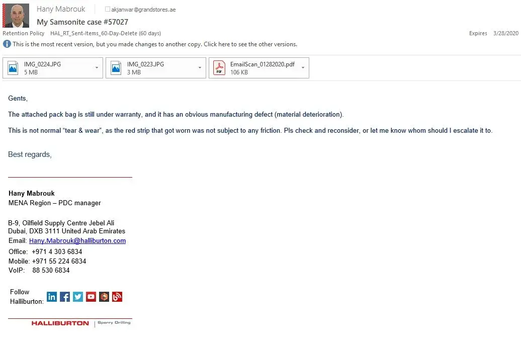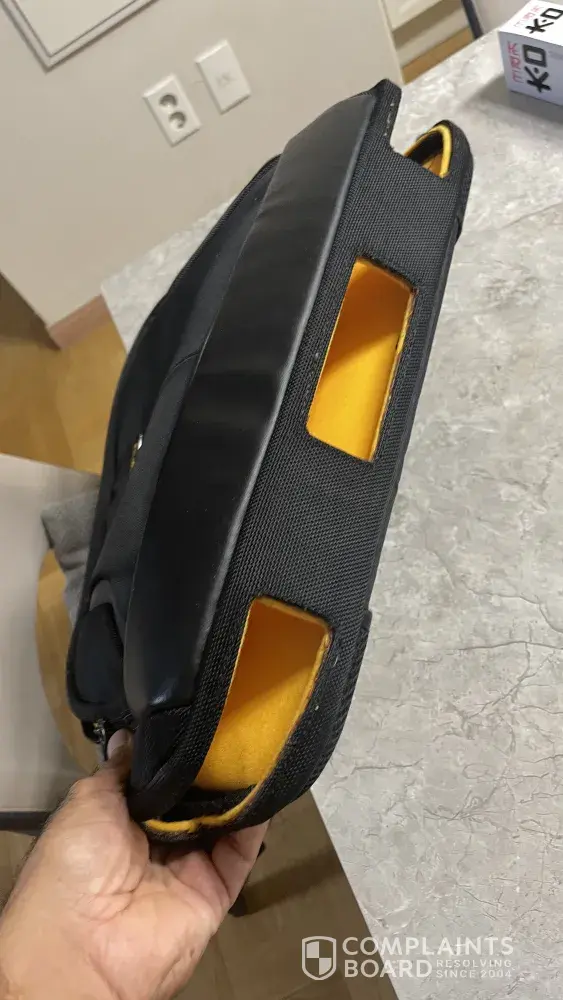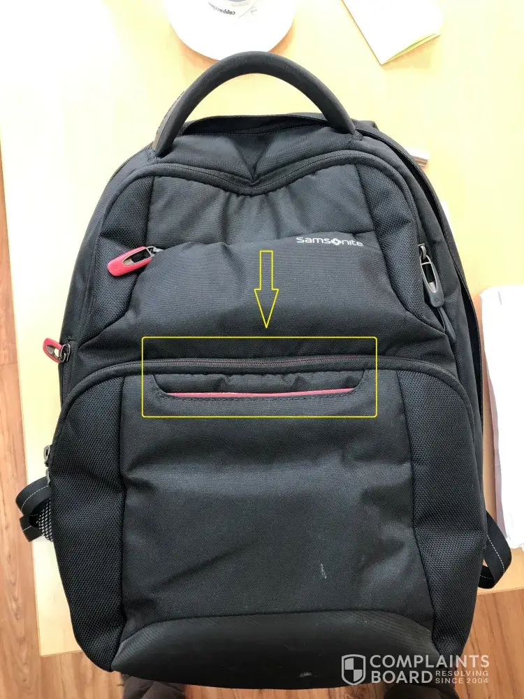 I am useing my bag for my daily travel from home to my office and carrying with it just my laptop, power bank, portable HDD, my wallet and my charging device of my mobile phone. It weights approx. 4 to 5 KGs.And half of my way from home to office is with my car which means my bag sitting near by me. I never leave my bag down because I'm so particular about my bag. I can either carry it or hang it on my back.I used many bags because of my neck hernia, but the bag I bought from samsonite made me the most comfortable. So, Although I am very satisfied with my bag, it is not possible that the deformation on the bottom and outermost lid of the holding handle is caused by my use.Here i am sharing the ticket which shop gave me and pictures of my bag. I want the issue to be reviewed by you and my grievance removed.you can contact me via my email address [protected]@hotmail.com or my mobile phone# +[protected] at any time.