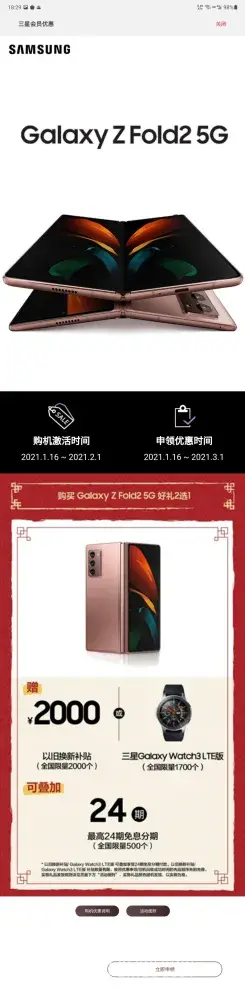 1. I bought a Samsung galaxy Z Fold 2, and in the app (called Samsung assistant)sales promotion, I can apply for a galaxy watch 3 LTE edition as gift. I applied the gift and type my receiving address in the app (on Jan.15 or 16), and did further confirm after 7 working days (on Jan. 26) from the first application date following the rules shown in the app without any caution or warning to me. According to the rules, the watch will be sent to me within 7 working days. However, I didn't get any update since then. On Feb. 2, I made call to samsung for the first time, and get the answer I am not qualified because I bought the phone online. There is no related rule statement on the app page (attached picture, as comparison, I also upload similar promotion page in app for note 10+, while the page of note 10+ say that this campaign is only for customer offline) and there isn't any limitation or rules statement during my whole apply process