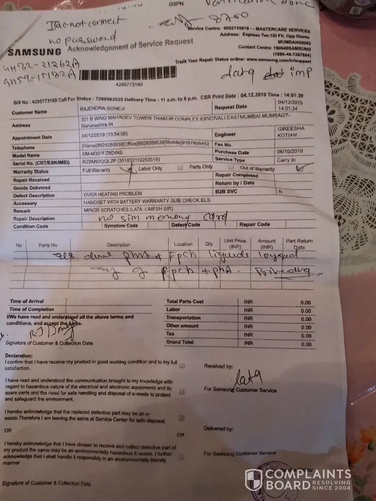 Sir I have already informed Mr. Nelson Pradeep and the staff on the phone and in writing that I shall take the matter to the principal-Samsung Korea to review my case and if not repaired in warranty I shall also put the matter in social media and spread the words with my friends that one should avoid buying Samsung mobile phones if travelling abroad as it does not stand the heat and cold of other countries and seems ignored by the Indian partners.