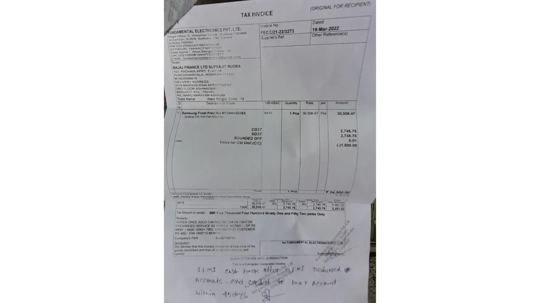 I am a lover of 'samsung' brand and my most of the home appliances are from samsung only over the years as I was happy with the products... But unfortunately now I am frustrated with your frost free refregerator rt34a4533bx purchased on 19 mar 2022 from your authorised outlet m/s fundamental electronics pvt ltd. At city centre 1 kolkata 700064 west bengal india vide invoice no : fecc/21-22/3273 ; dtd.19.03.2022 as just after the guarantee period on 19th mar 2023 it has started with water deposition at the bottom of the case just under the vegetable tray as much as that we need to soak it from clothes time and again repeatedly.