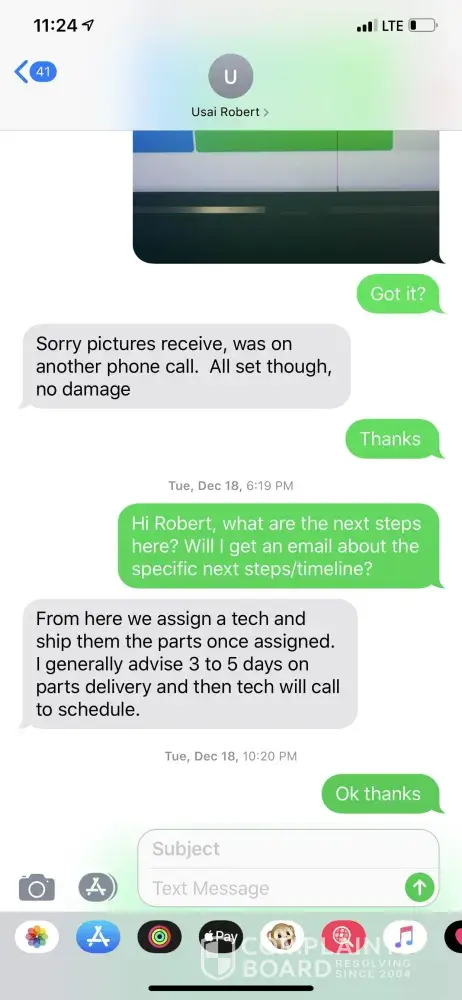 Robert's txt - "Sorry, pictures received, was on another phone call. All set though, no damage. From here we assign a tech and ship them the parts once assigned. I generally advise 3 to 5 days on parts delivery and then tech will call to schedule"