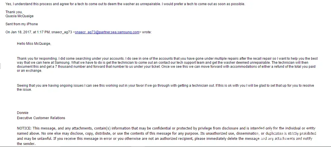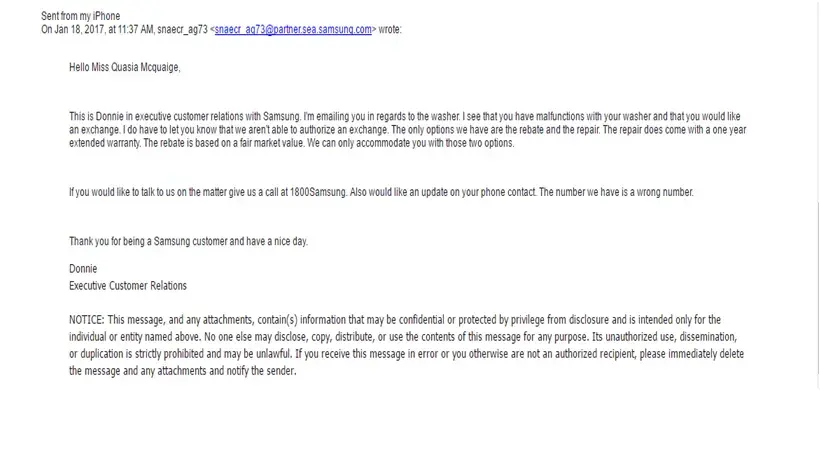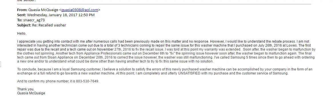 My Samsung experience has been entirely and exceedingly dreadful for these past 4 months. To begin with my story, I purchased the Samsung top load washer machine (Model number: WA40J3000AW/A2, Serial number: 0DLC5AUH413683T) from Lowe’s on July 30th, 2016 for my first apartment I moved into in August. For the first couple of months, the washer had it’s pros and cons. Pros included the cleanliness, design, and cycle time. Cons included the chiming when the clothes were finished and how noisy it could be when the clothes were spinning. Overall, I felt like I had made a good purchase for the price. However, I was informed in November 2016 of the recall that had been announced, which applied to my washer. A couple weeks later, I noticed the washer abruptly stopped and the clothes didn’t go through the spin cycle. I immediately thought it was because of the recall. I called Samsung a couple days later to have a technician come out. A recall technician apart of Dish Network came out on November 27th, 2016 with a recall kit. I asked the tech was the issue of the clothes not spinning because of the recall and he replied by stating that it may or may not but he was only aware of how to fix the recall issue and that if the clothes did not spin after, that it was a deeper issue. I was then told at this point my warranty was extended due to the recall. Sure enough a couple days later, the washer began to malfunction again with the clothes not spinning. I called Samsung again to set an appointment for a tech to come out to fix this “deeper issue.†A technician by the name of Sam from Appliance Professionals, LLC came out on December 6th, 2016 to "fix" the spinning issue. He advised me that a “clutch†for the washer needed to be replaced in which he switched. I believed my issues had come to an end. After about 2 cycles and a couple weeks later, the washer began to malfunction yet again. Tech #3 came out from Sloan Appliance on December 20th, 2016 to correct the same issue. This technician advised me that there was another part that needed to be replaced and stated the tech before replaced the wrong part. (Surprising?) The tech came out a couple days later to replace the part. The washer worked for exactly 1 cycle. However after, you guessed it, the washer began to malfunction. At that point, I was just ready to receive a refund. I called Samsung numerous times about this matter for the past 4 months to get absolutely no where. On January 4th, 2017, I spoke to Violet (Ticket number [protected]), who told me that a person from the Executive Customer Relations department would give me a call within 48 hours to try to figure everything out. I asked if I could speak to somebody within the department and was told that they only make outbound calls. I never received a call. On January 7th, 2017, I called again and spoke to Charlie. (Ticket number [protected]) Charlie assured me somebody would call me back within 72 hours with a solution to my problem. I never got that call. On January 18th, 2017, Donnie from the Executive Customer Relations department emailed me and apologized about the mishaps I had endured up until that time and discussed that neither an exchange or refund could be fulfilled, with the only option being to get a rebate or get it repaired again. I sent an email back in summary stating how furious and upset I was about a new washer I had purchased becoming defective and not being able to get a refund for it. I also stated that something had to be done because it was unacceptable to be told I could not get a refund for a defective brand new washer. Donnie responded back kind enough to state that a refund process could begin and a tech would have to come out to deem the washer unrepairable in order to go forward. I scheduled the tech to come out on February 1st, 2016 specifically stating the reason to come was to deem the washer unrepairable and to make sure it was defective. The tech came out on that day and did what he could to try to get the washer to spin, stating that what he tried did not work. He stated that the information would be given to Samsung and the company would give me a call. A couple weeks went by and no call was received. (A pattern that occurred every time) I called the service company, Appliance Professionals, LLC to check the status. I spoke with a manager named Allison and she stated that the work order had no notes of the washer being deemed unrepairable and the tech stated that I told him not to work on it. (INCORRECT) I assured her that this was not the case and that the washer was supposed to be deemed unrepairable. Allison told me that she would talk to the tech herself and get the details and give me a call back. (Never got the call) On February 16th, 2016, I called to check the status and another representative of the company told me Allison called Samsung to let them know about the washer being deemed unrepairable. I was given a ticket number to get the status of the refund ([protected]) and a specific phone number this time. [protected]) I called Samsung that same day and after being transferred back and forth, I told the numerous reps I needed to speak to somebody within the Executive Customer Relations department. I got transferred to a representative by the name of Raven, who stated she was close to the department. Raven stated that a receipt would have to be emailed to: [protected]@sea.samsung.com to move forward with the process. I received yet another new ticket number. ([protected]) At that point in time I felt like I had finally gotten somewhere. Note, I bought this washer on July 30th, 2016, and the words on the receipt were heavily faded. I asked Raven if the receipt would still be accepted and she stated it would. The same day, February 16th, 2017, I sent pictures of the receipt specifically stating I tried my best to capture the price of the washer. Two days went by and I didn’t receive a response. I called Samsung and a rep by the nam