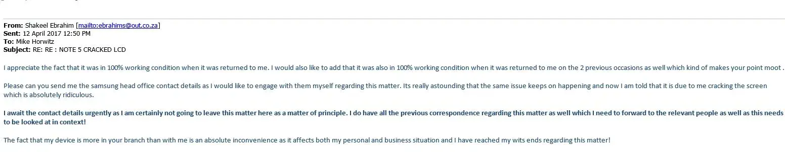 I have received the most disgusting service for Samsung the Grove. My device has been booked in twice at Samsung the Grove and returned to me with a faulty screen where the screen goes Purple. After being possession of the phone for a few days since getting it back from Samsung the screen once again went purple. Please note that i have all the communication via email where they confirmed that the screen as in fact faulty. The screen has once again gone purple and i am now told that this is due to a cracked screen which i find absolutely ludicrous! I am told i must pay for the repairs! I have been dealing with Mike Horwitz who simply referred me to Samsung head office. I have attached a small piece of an email and the balanced of the emails will be sent to the relevant media outlets outlining what has transpired.