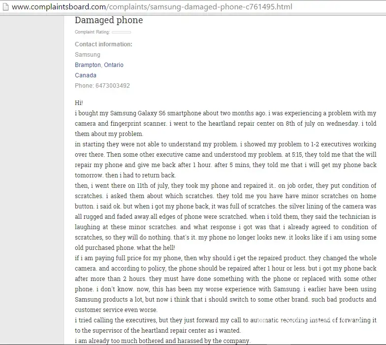 I am facing so much of botheration from the samsung products this time. The cell phone I complained about is causing the same problem again. Tit feels like wasting money on a useless mobile. I bought such an expensive phone, samsung galaxy s6 and its causing too many problems from starting. Firstly, the product problem, then the worst customer service and now even the worst technical assurance of the product. They are just selling their products, gaining profits and along with it, decreasing the quality of products. It is using such cheap kind of material that it is causing problems again and again.