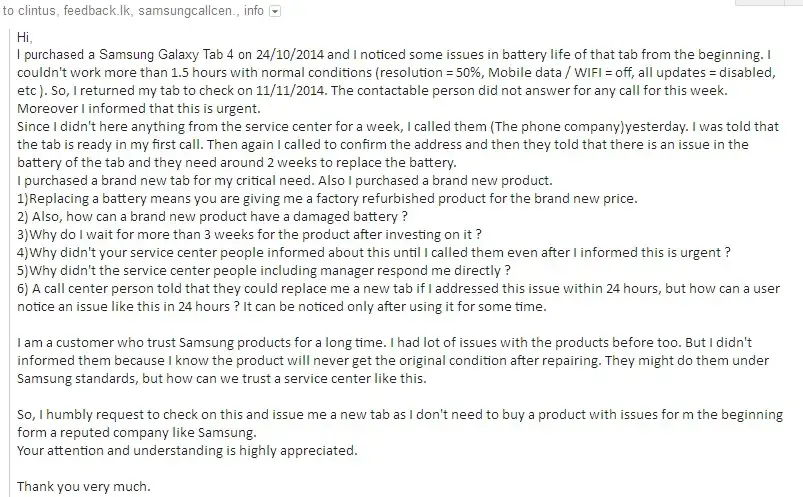 I purchased a Samsung tab4 from Samsung. But from the first day I noticed that there are some issues with that tablet. Issues with Battery, data connection...I spent with the tablet for some days to confirm that. Then within 2 weeks I returned it to the Samsung service center, 'The phone company' to check that.They gave a contactable person called 'Mark' and his phone was not answered anytime. I waited for 8 days. Since I didn't hear anything from them, I called them after 8 days. From my first call I was told that my tab was ready. Then I called them back to confirm their address to collect the tab. But then they told that the battery of the tab has some issues and they don't have batteries for the tab and I have to wait for 2 to 3 weeks to get my tab. Their manager Mr.Clintus asked me an interesting question. He also replied me after I called more than 20 times. He asked, why didn't I called him. Why do I call him? How can I get his number ? Who told me to call him ?