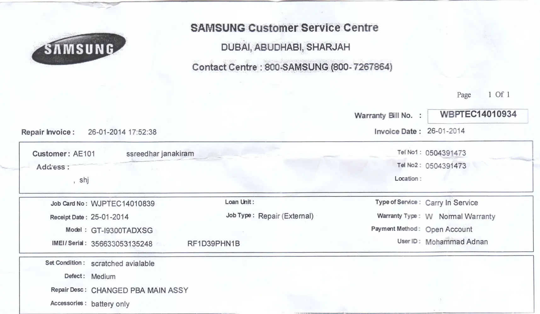 I gave it to samsung customer service centre in sharjah on 26th january 2014. They said the pba main assembly has been changed and its working. Again the same problem started and given for service on 21st april 2014 and got back with pba main assembly changed. Now after 6 days I am again facing the same problem.In addition to this the charger takes about8 hours to charge fully. The service centre says the charger has to be changed at my expense as the charger warranty is only for 6 months how many times should I run around the service centres? Having bought an expensive cell phone, this is the price I have to pay!. I request the complaints board to take some action in this regard. I should get the value for the money I have spent. The receipts of customer service centre is attached herewith,